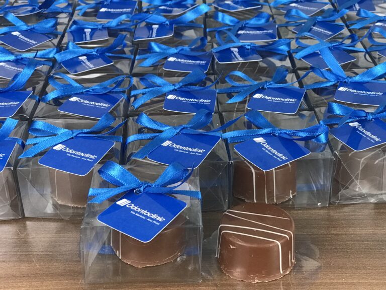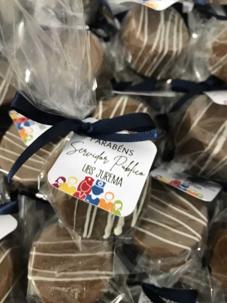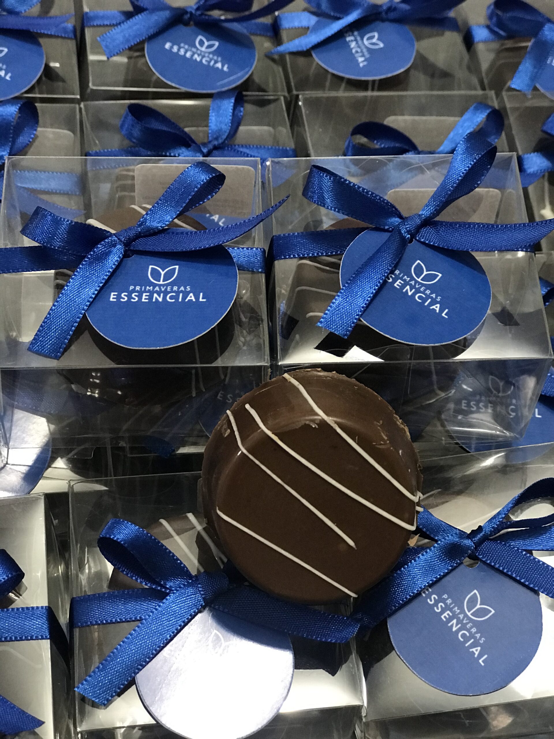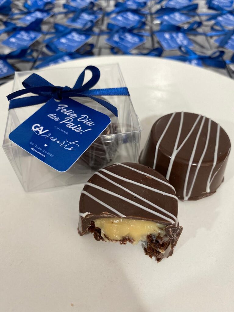 Embalagem personalizada com laço e tag. Cada unidade carrega carinho e sofisticação.